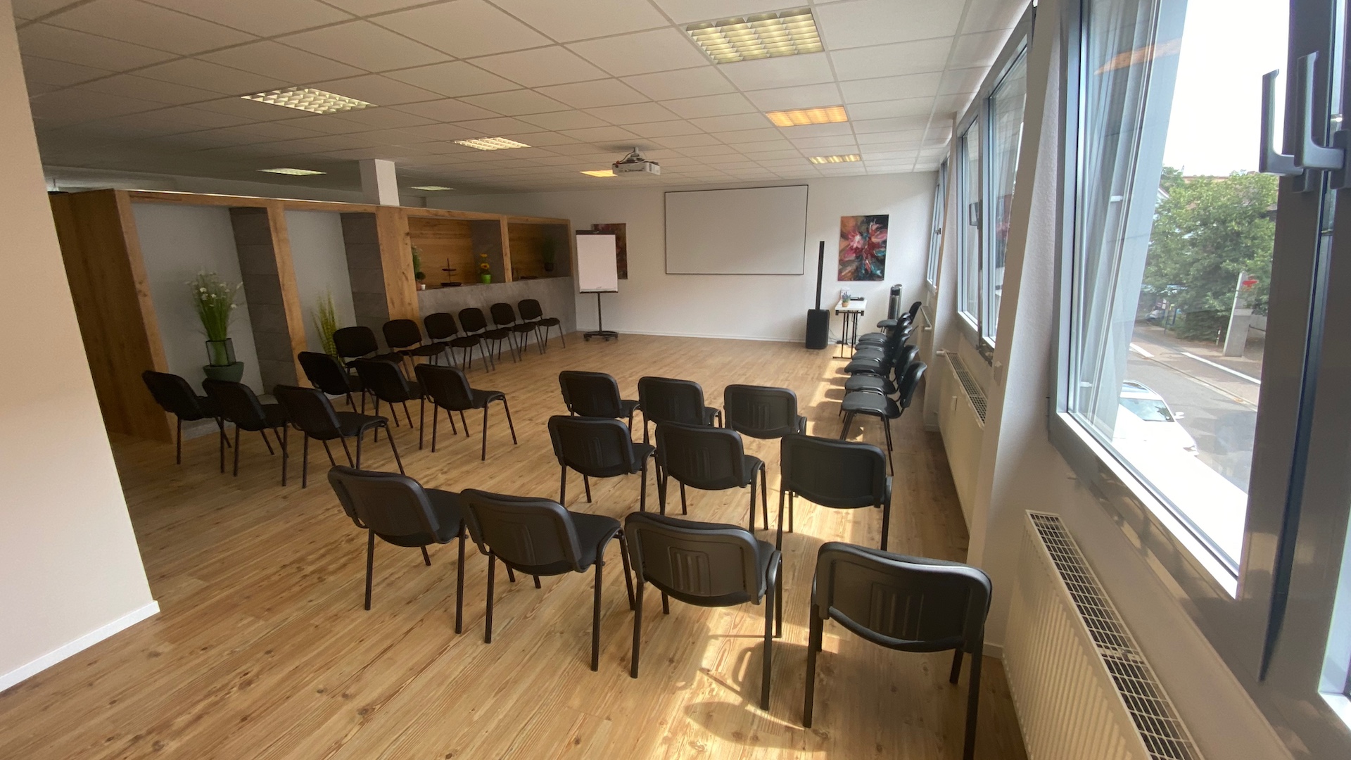 🔹 Großer Seminarraum für bis zu 48 Personen mit Tischen (ca. 60 ohne Tische) – variabel nutzbar, lichtdurchflutet und mit spürbar positiver Atmosphäre.